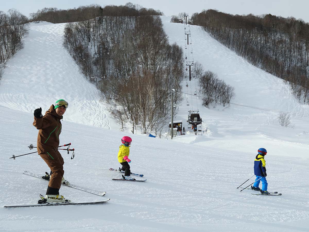 「鐘の鳴る丘ゲレンデ」は約1,000mの緩斜面かつ幅約1,200mで初心者の方やファミリーに人気。鐘を鳴らすのを忘れずに。