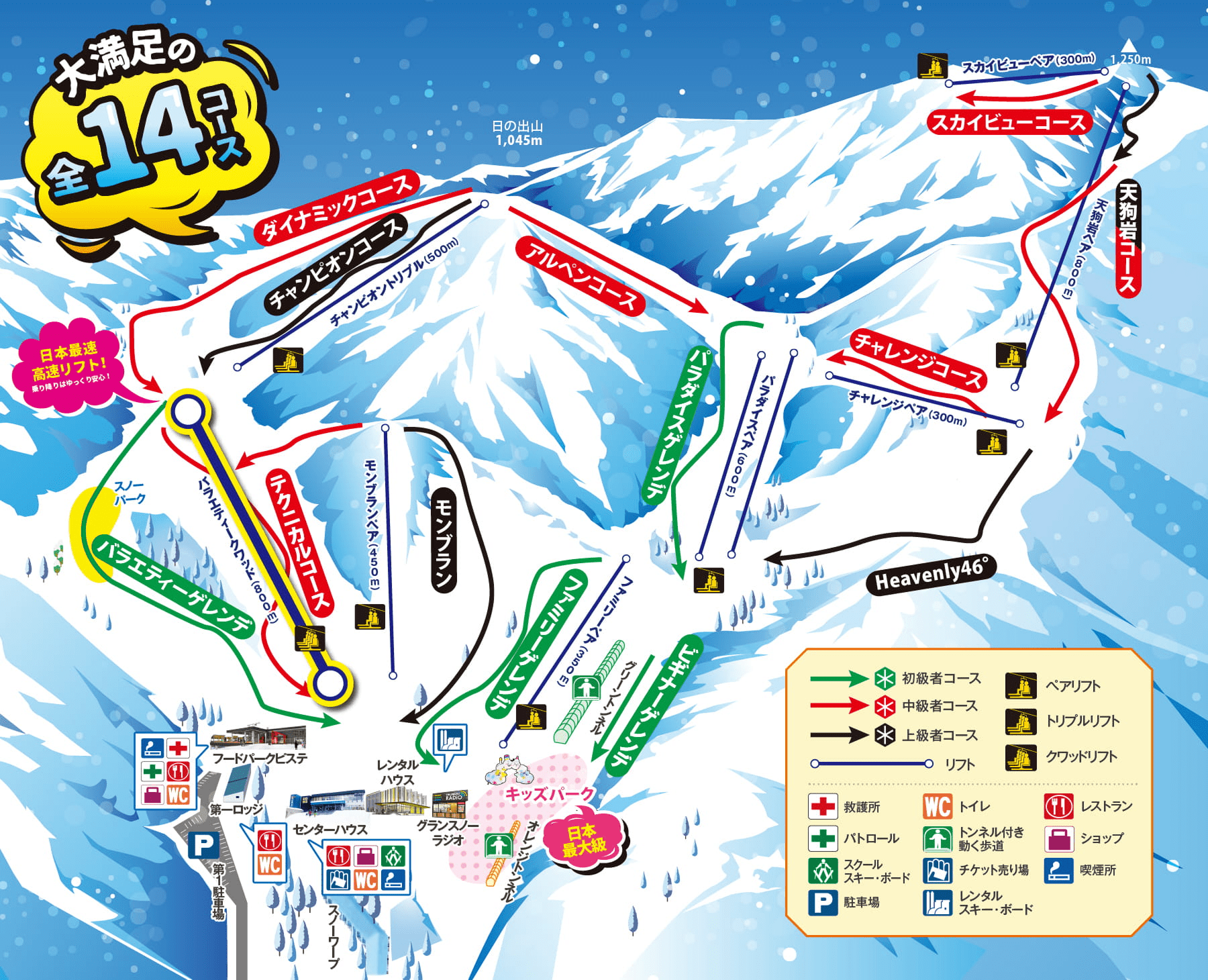 全14コースがあり、最長滑走距離は2,500mです。初級・中級・上級の各コースがバランスよく配置されており、幅広いレベルの方にお楽しみいただけます。