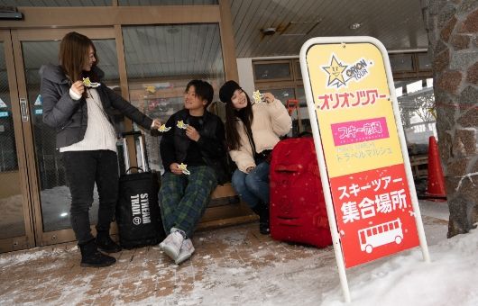 帰る日は朝のうちに荷物は宿に預かってもらい、チェックアウトしてからゲレンデに。スキー場で存分に滑りを満喫したら、時間にゆとりをもって宿に戻り、レンタル用具を返却したり、着替えをしたりと帰る準備を済ませよう。一般的なツアーでは、指定の停留所でバスが来るのを待つケースが多く、雪の降る日や気温が低いときは、この待ち時間がちょっぴりつらい。しかしオリオンツアーでは、迎えのバスが到着すると現地係員が宿泊先まで知らせにきてくれる。それまで宿のロビーなど暖かな場所でくつろいでいられるからうれしい限りだ。バスに乗ったら、高速道路のサービスエリアでの休憩をはさみつつ、ぐっすり眠って帰ることができる。滑って、遊んで、食べて、飲んで、たくさんのイベントを手軽に楽しめるのが、宿泊プランのよいところだ。