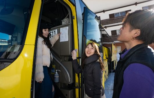 バスに揺られてのんびりとスキー場へ。山へ近づくと窓の景色が銀世界に変わっていく様子にわくわくする。