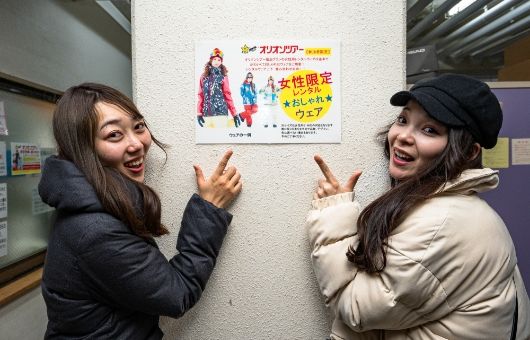 女性を対象にオリオンツアーの宿泊プラン利用者は追加料金なしでグレードアップしたウエアをレンタルできる。これはうれしいポイントだ。【例:ホテルハイツ志賀高原】
