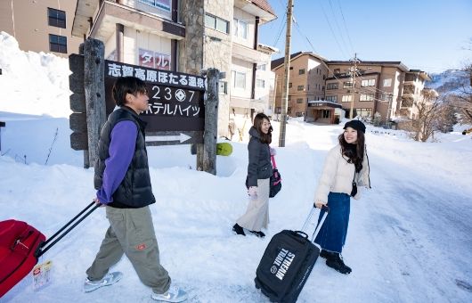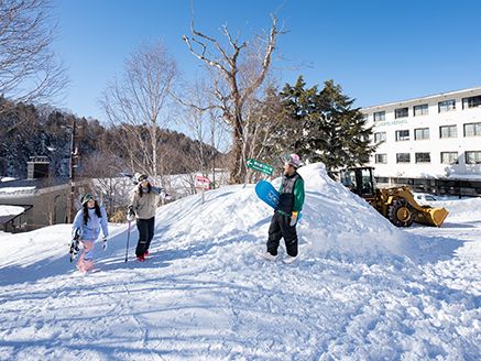 スキー場まで歩いてアクセスできる宿も多い。身支度ができたら目当てのスキー場にレッツゴー!