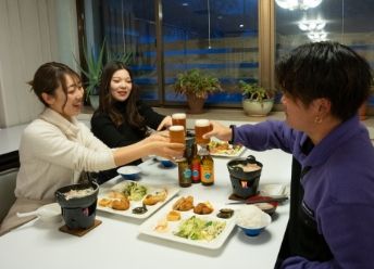 ビールで乾杯したら、楽しくわいわい食事をスタート。明日に備えてたっぷり食べよう。