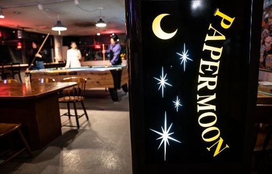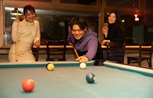 ビリヤードでは後ろからあれこれアドバイスが送られ、笑いが絶えない。