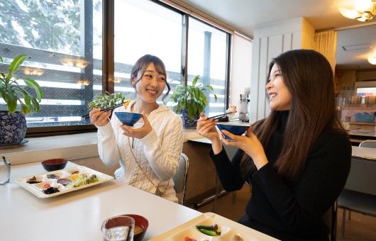 朝食のバイキングにはオムレツやハムなどが並ぶ。パンとごはんが用意されているので、おかずを選びながら和食・洋食のどちらのスタイルでも朝食を味わえる。今日もたくさん滑るから、エネルギーチャージ満タンで元気よくゲレンデに出かけよう。