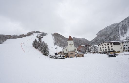 リフト乗り場に大きな時計台がある「サンバレースキー場」。山麓にはホテルが並ぶ。
