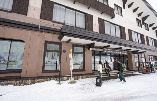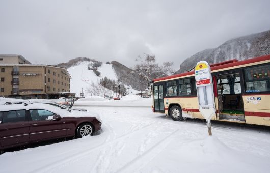 駐車場の向こう側に見えるのが「サンバレースキー場」。シャトルバスの停留所も駐車場のすぐ横にあり、バス降車後は歩いてすぐの宿を利用できる。