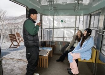 窓から景色を楽しみながら4分ちょっとの空中散歩。さらにゴンドラやリフトを繋いでスキー場めぐりに繰り出せる。