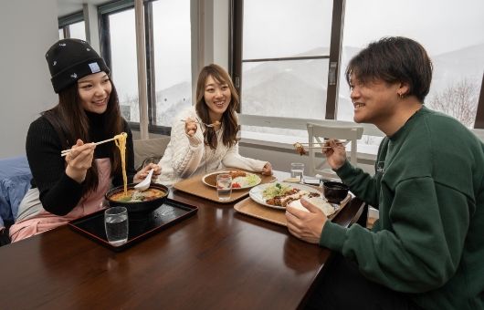 国道から横道に入った場所にある「志賀高原 山の駅」は、昔、ロープウェイ駅舎だった建物を改築したもの。2020年、建物横に「志賀高原リゾートゴンドラ」が新設されたことで、志賀高原の新しい玄関口として活気が高まる注目のスポットだ。館内にはレンタルコーナー、更衣室やロッカールーム、レストランや売店など、必要な設備がまるごと揃っている。昔のロープウェイ駅舎もそのまま残されており、現在はホームから雪山を撮影するフォトスポットとしても人気が高い。