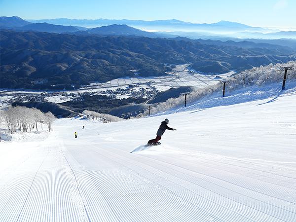 豊富な積雪量とエリア随一の極上のパウダースノーを楽しめます!頂上からは北アルプス後立山連峰や妙高を含む北信五岳を望むことができ、絶景が眺められます。