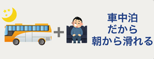 朝出発ではないので、朝早く起きれない方にオススメ!バスの中でゆっくり寝て、朝から思いっきり滑ろう!