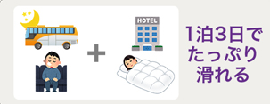 夜発のバスで出発し、スキー場でたっぷり滑って宿泊する充実ツアー!