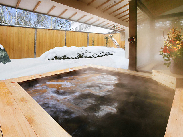 檜の香りの中でゆったりと温泉を楽しむ、檜造りの木の湯。