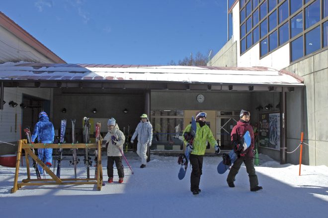 駐車場からゲートハウスに向かうと、入り口にまずリフト券売り場。さらに進むと更衣室、そしてレンタルコーナーと続き、ゲレンデに出るまでの流れがスムーズにつながるようになっています。特にレンタルコーナーは品揃えが豊富。サロモン・アトミックステーションが設置され、ここではそれぞれのブランドのハイグレードモデルもレンタル可能。用具の性能にこだわる上級者であっても、ここのレンタルはちょっと見逃せないですね。