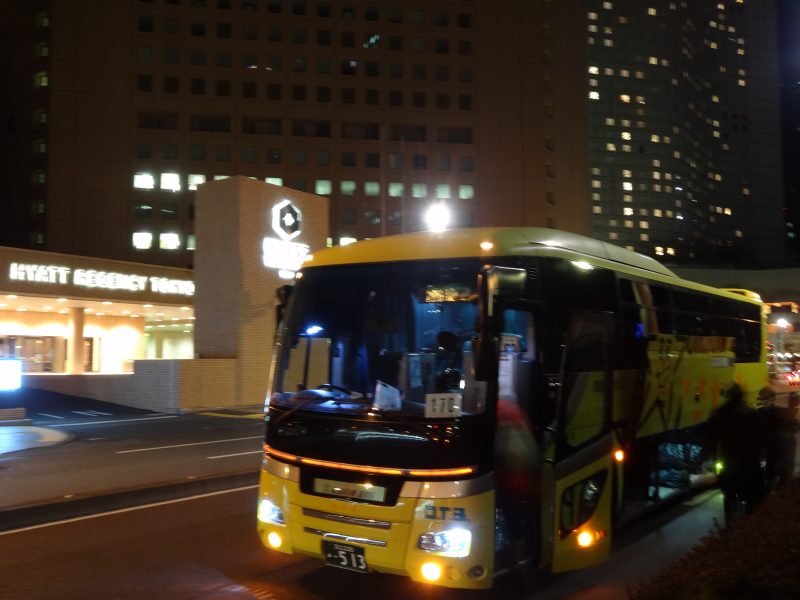 出発は都営大江戸線「都庁前」駅から直結の広場。22時40分に集合し、点呼を取って出発は23時。バスは座席の間隔が広くゆったりしているタイプのため、足が伸ばせて夜行で寝ていても辛くありません。また、それぞれの座席にはコンセントやACアダプタも備わっていて、スマホや携帯の充電に便利です。遅くまでゲームで遊んでいる人もいましたよ。中央道を走行中は途中サービスエリアで3回ほどトイレ休憩タイムがあるので、女性も安心です。