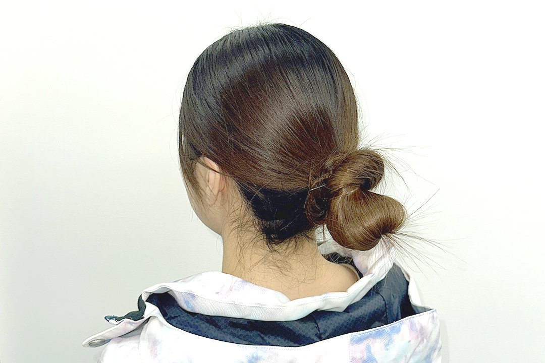 後頭部でシニョンをつくったあと、残った髪の先をゴムで結んで「くるりんぱ」します。少しほぐしたあとに、シニョンに巻きつけて、ゆるふわお団子スタイルの完成!