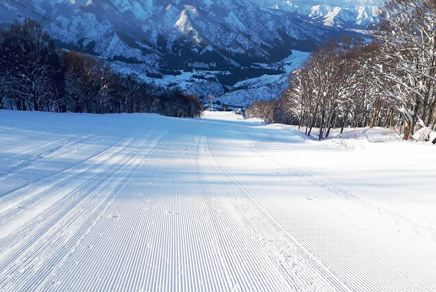 越後の山々や市街地が一望の絶景が広がるメインゲレンデは、最大幅200mと広々で滑りやすいから上達が早く、ファミリー・ビギナーにおススメ!