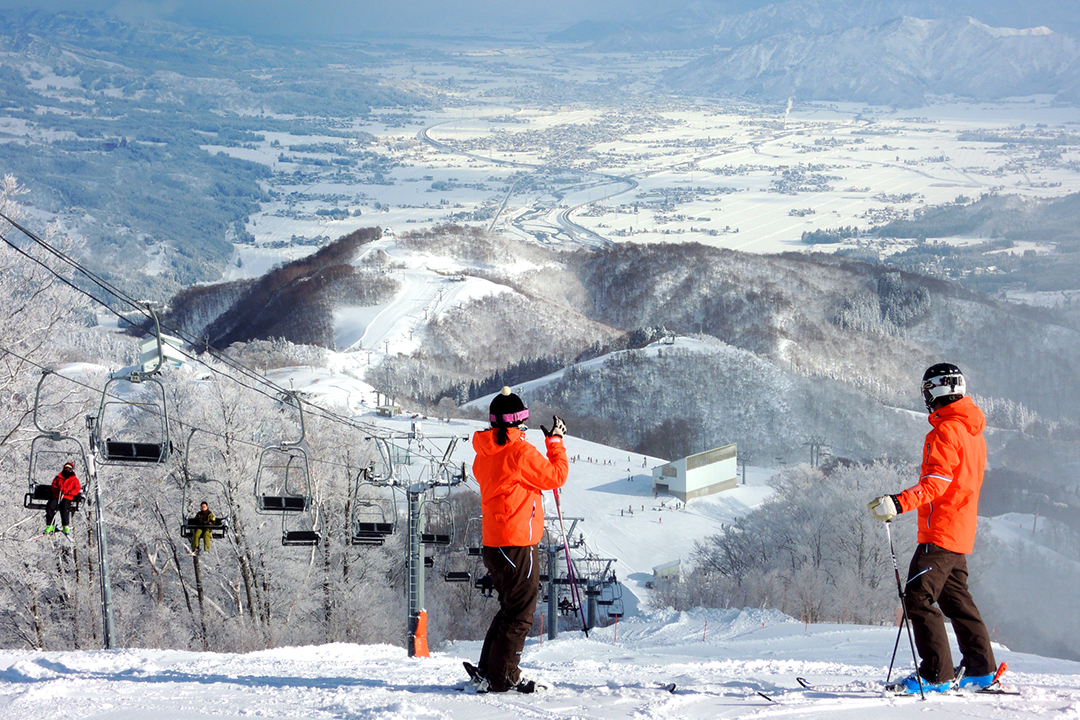 新潟県南魚沼郡湯沢町の岩原スキー場は、日本有数の超ワイドな緩斜面と、そこから見下ろす美しい眺望が魅力のスキー場です。東京からは上越新幹線の越後湯沢駅で降り、東口側から発車する無料の送迎バスを使って約10分で到着。
