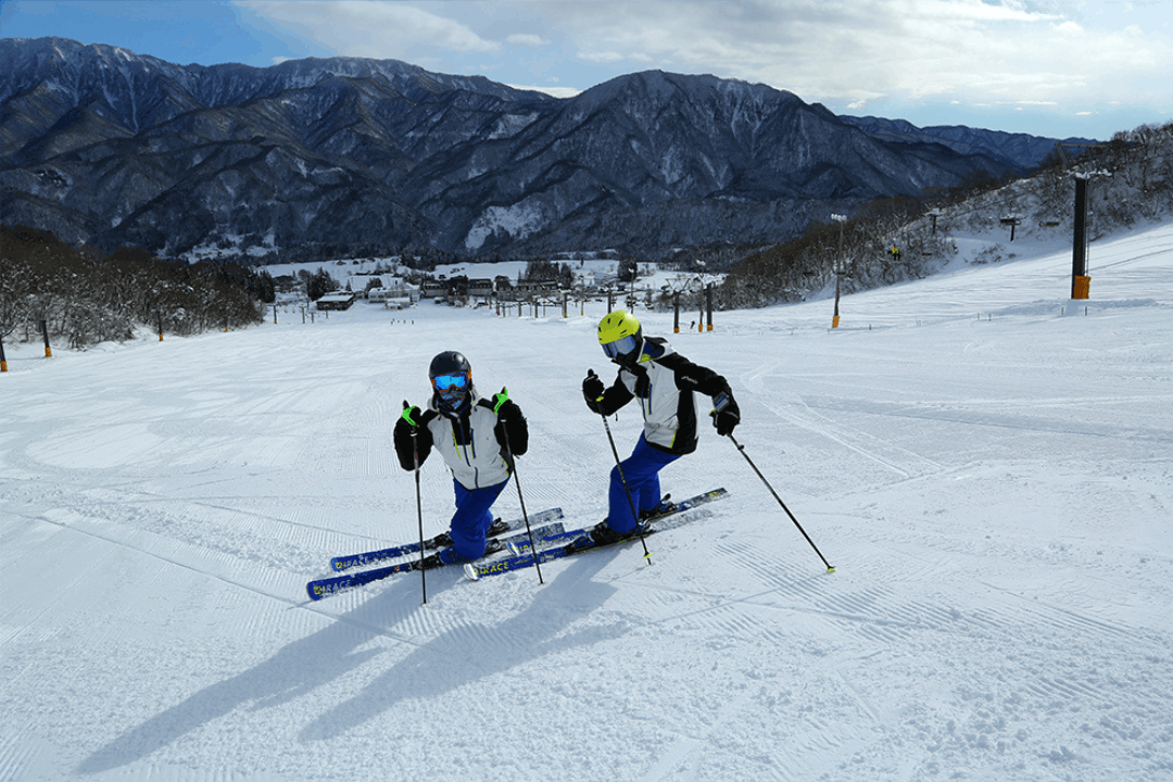 上級者はパウダースノースポットでもある、稗田山コースに挑戦。標高1,400mから見る北アルプスや妙高連峰は圧巻です。