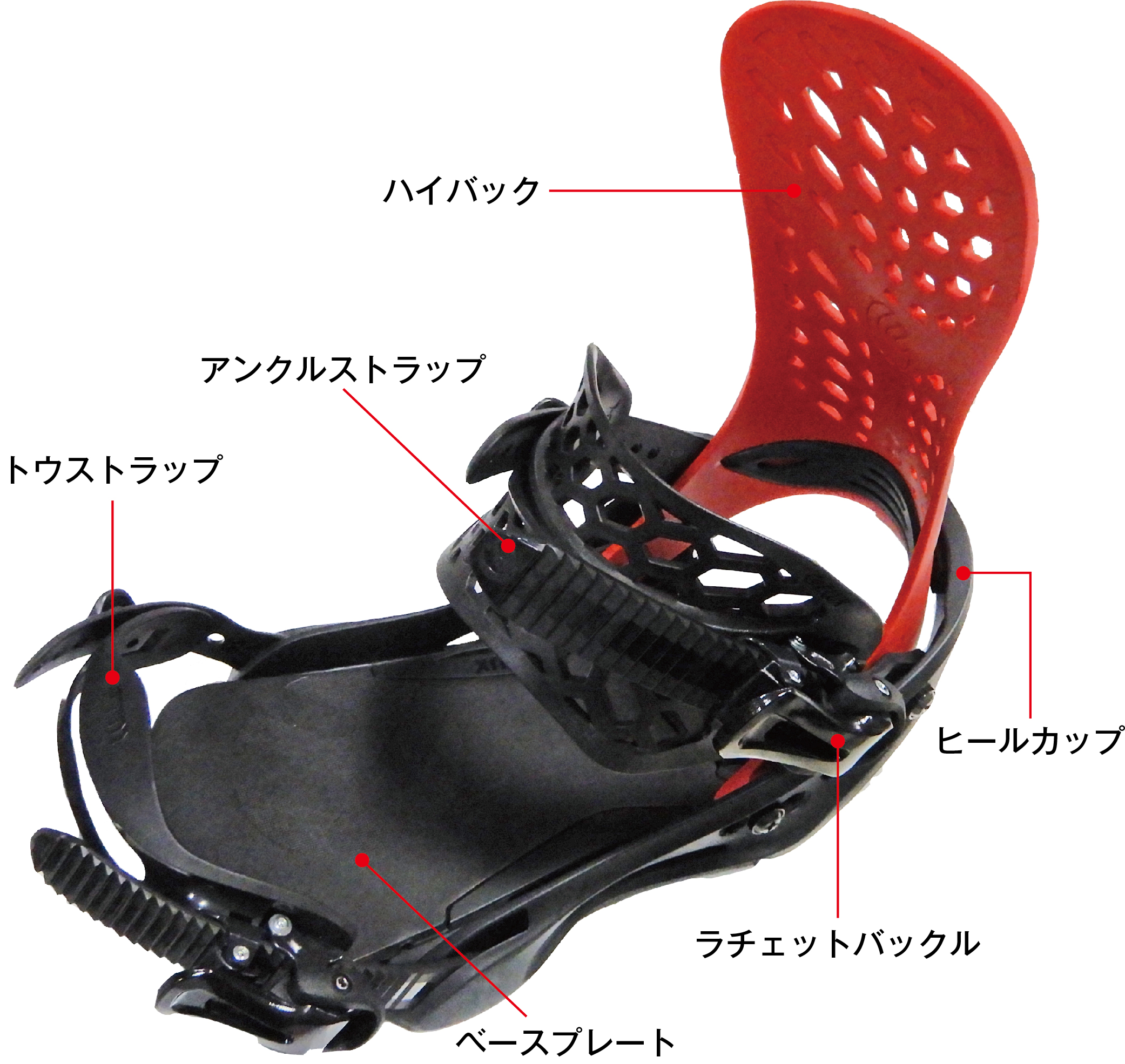 一般的なスノーボードのビンディングは、ボードに固定するベースプレートとディスク(スタンスやアングルを変えられるように、ビスによって固定位置や角度を変更可能)、ハイバック(前傾角度や方向を変えられるように、ビスなどによって固定位置や角度を変更可能)、ヒールカップ(ブーツの踵がおさまる部分)、ストラップ(一般的につま先と足首の2カ所、ラチェットバックルで締め付けを調整できる)などのパーツからなっています。