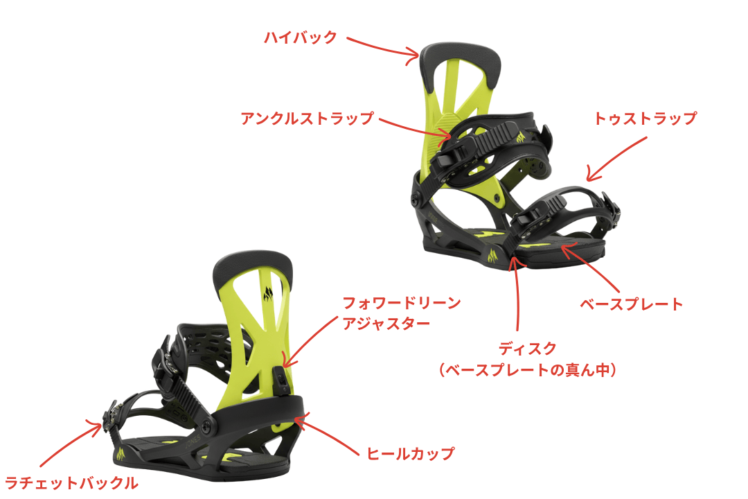 一般的なスノボのビンディングは、ボードに固定するベースプレートとディスク、ハイバック、ヒールカップ(ブーツの踵がおさまる部分)、ストラップなどのパーツからなっています。