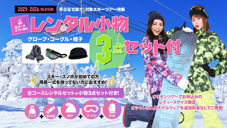 - 小物レンタル3点セット付スノボ・スキーツアー特集
